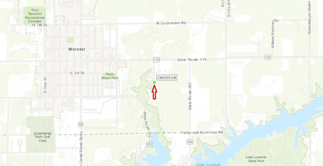 The transmitter location is 1 mile ESE of Minster, south, off Ohio Route 119. Point your antenna toward this location to get a reliable signal.